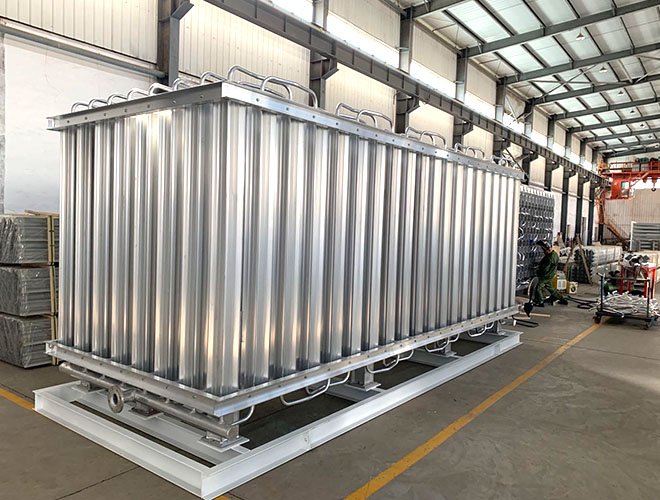 高壓空溫氣化器直接安裝在站場(chǎng)內(nèi)部,用以將柱塞泵升壓后的低溫液體通過(guò)吸收自然環(huán)境的熱量直接氣化成為高壓氣體,完成液體到氣體的轉(zhuǎn)變。