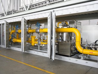 調(diào)壓計(jì)量撬是經(jīng)過主氣化器氣化后的氣體,由于等壓氣化壓力基本保持和儲(chǔ)罐壓力相近,一般用戶需求壓力是一個(gè)恒定的范圍內(nèi)的值,需要進(jìn)行調(diào)壓穩(wěn)壓。同時(shí)為了計(jì)量核算費(fèi)用或廠內(nèi)核算成本,對(duì)氣化后的LNG流量進(jìn)行計(jì)量,為了實(shí)現(xiàn)以上的功能組合在一起的裝置叫調(diào)壓計(jì)量撬。由矩形撬塊、調(diào)節(jié)匯管、控制閥、計(jì)量管、流量計(jì)、調(diào)節(jié)閥、調(diào)節(jié)管、過濾器、出氣管、進(jìn)氣匯管、進(jìn)氣口、出氣匯管、排污管和安全放氣閥組成。有的裝置內(nèi)需要加入加臭系統(tǒng)。